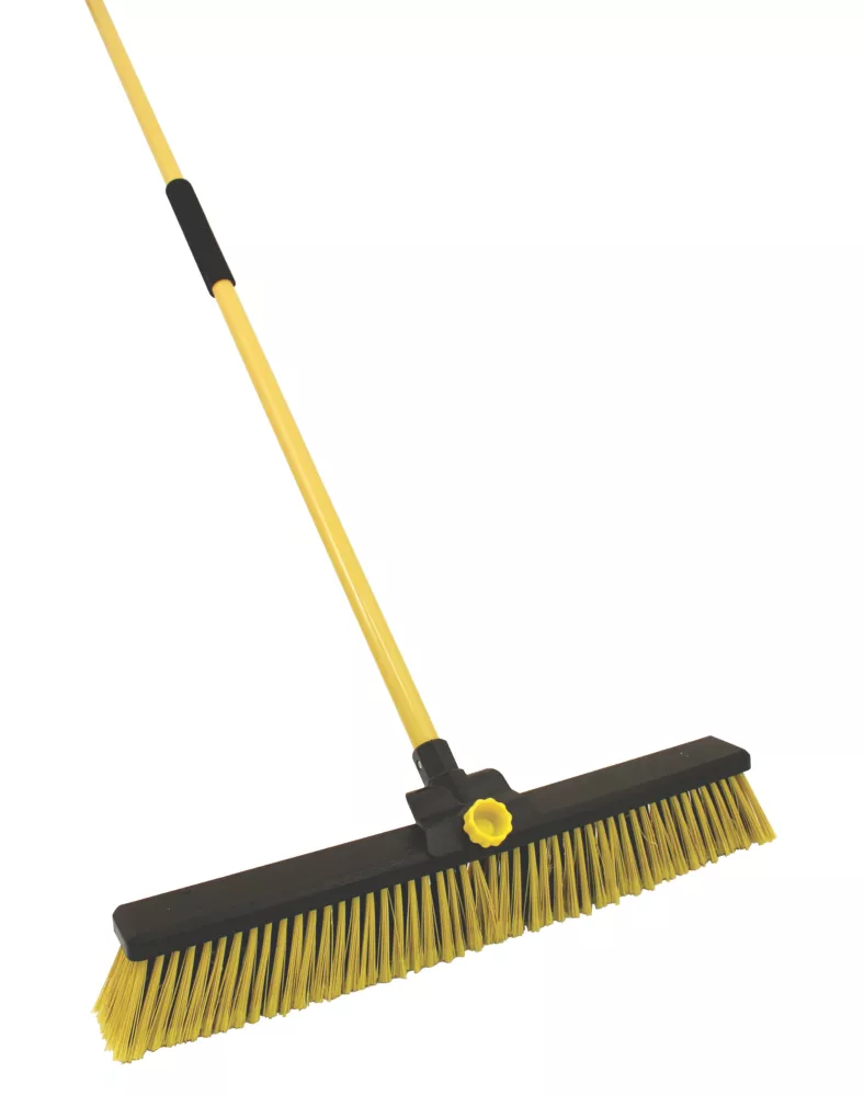 Combined stiff and soft PVC bristles ideal for sweeping up heavy rubble in wet and dry conditions. The soft bristles limit the release of dust particles. Fitted with a strong durable metal handle and heavy duty bracket. Neoprene cushion-grip for comfort. Reverse handle position maintains even wear of broom.
