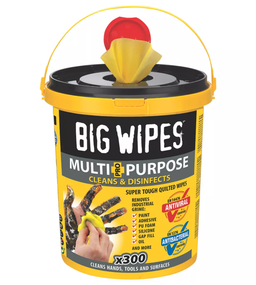 Industrial strength, multi-purpose, 3-layered, antiviral and antibacterial cleaning wipes. Suitable for removal of paint, silicone, PU foam, adhesives, tar, bitumen, oil, grease and more from hands, tools and surfaces.