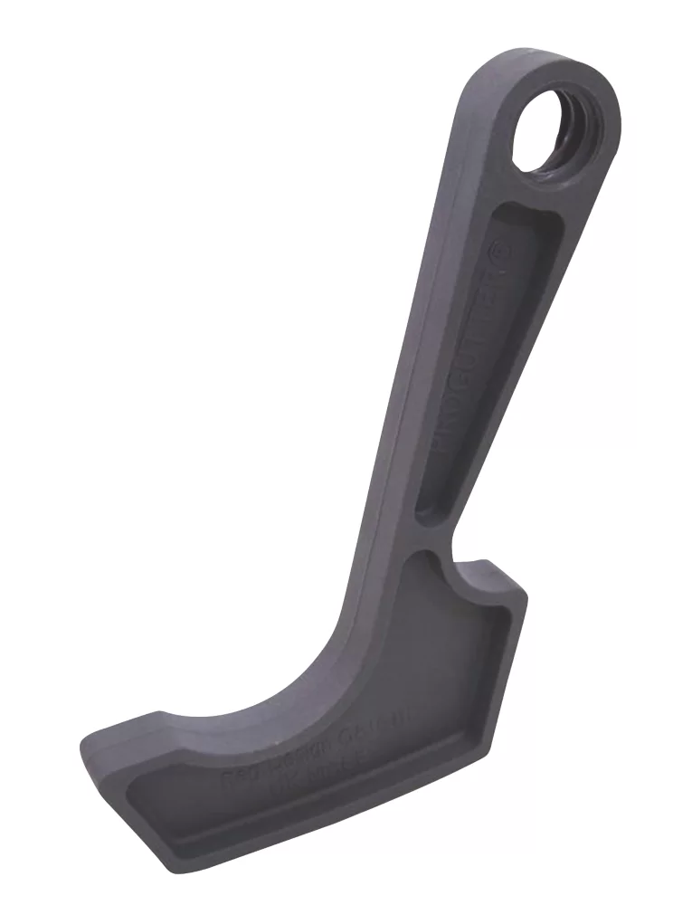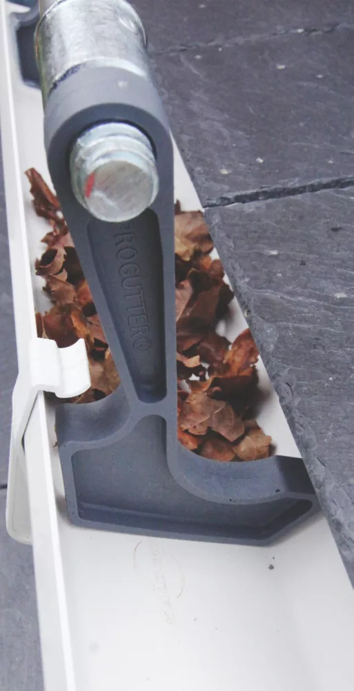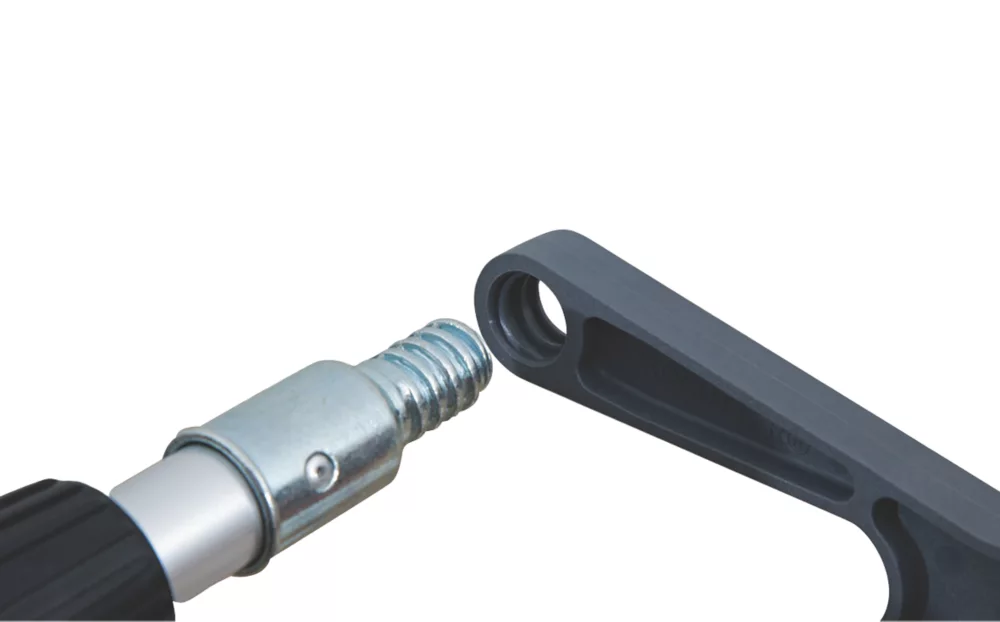 Square gutter clearing tool with universal thread allows tool to be screwed directly onto a standard telescopic pole. Product is designed to avoid contact with gutter securing clips so debris is pulled to one location for safe and convenient collection. Guttering can be cleaned from both directions without changing the ladder position.