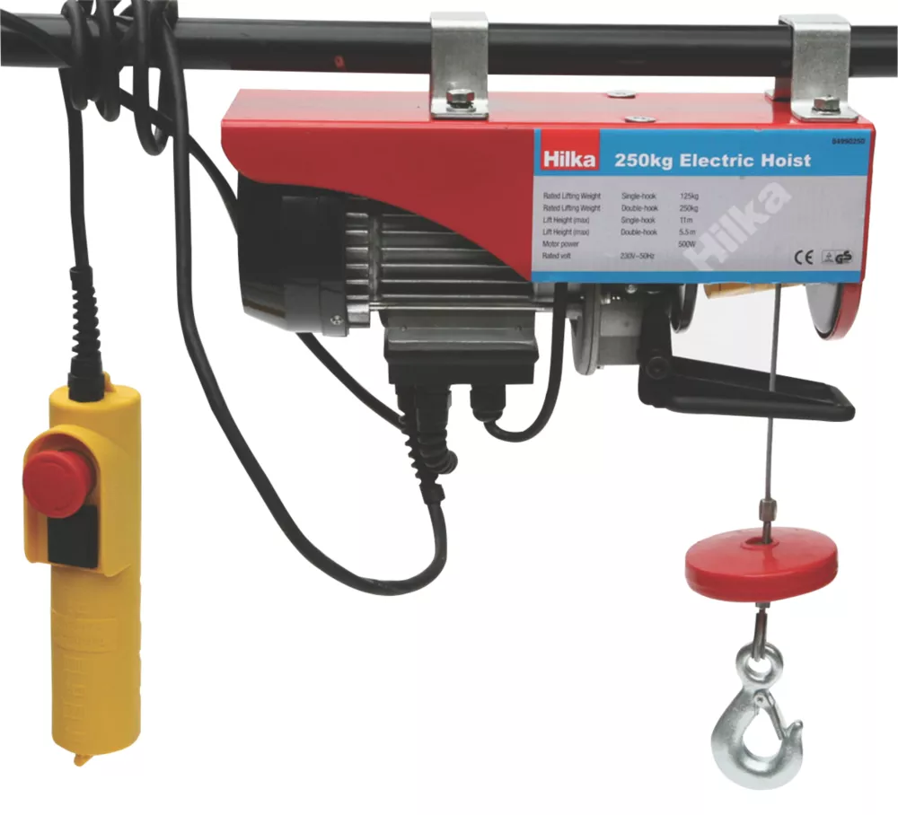Electric hoist with pulley and remote control for hands-free use. Support brackets included.