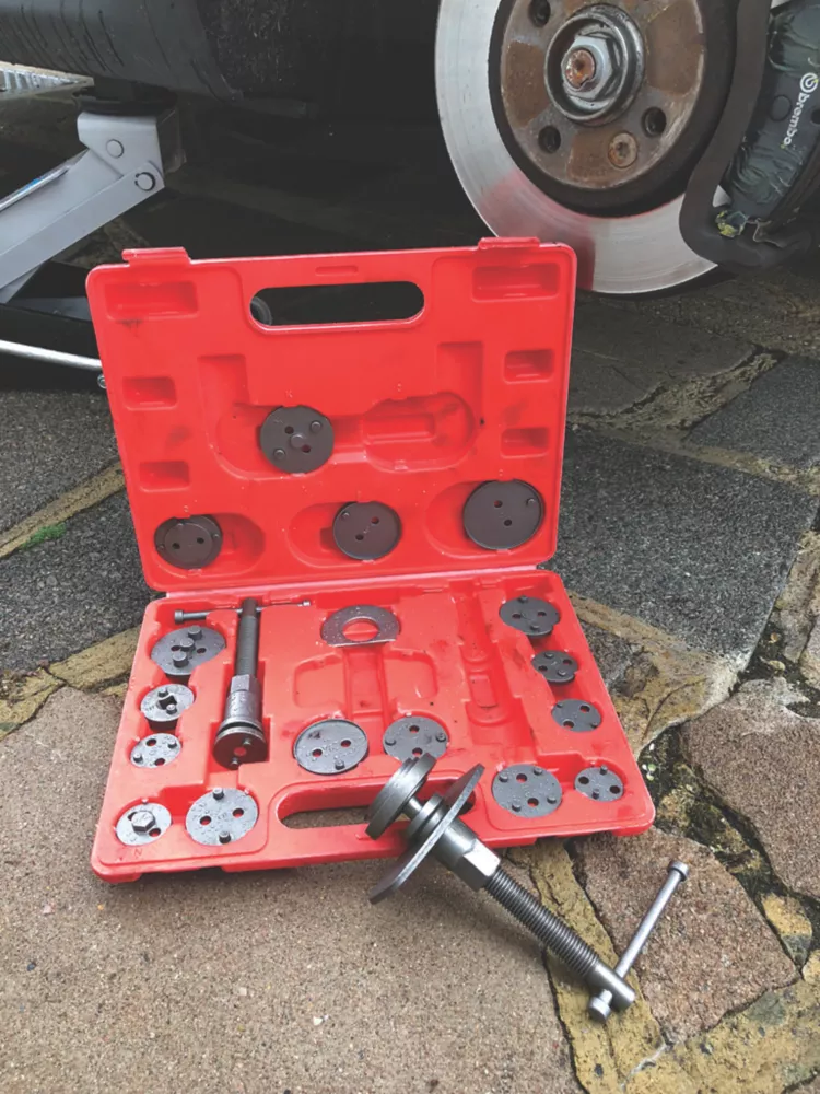 Strong, heat-treated carbon steel construction. For depressing and winding back brake caliper pistons when fitting new brake pads. Simple turn handle operation presses piston back to allow for thickness of new pads. Includes a wide range of piston adapters suitable for most vehicles. Supplied in a plastic carry case.