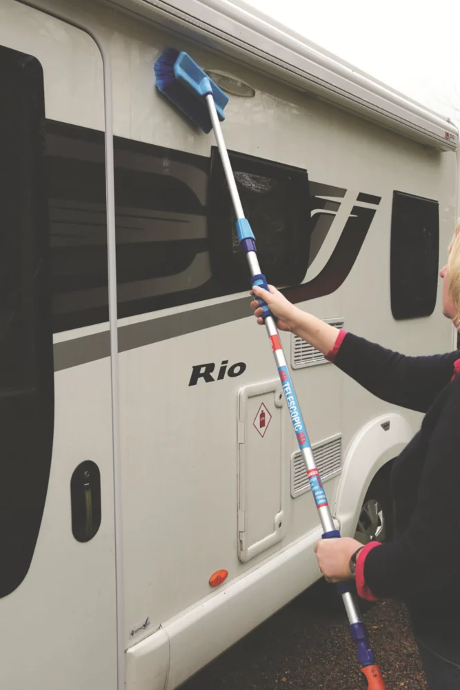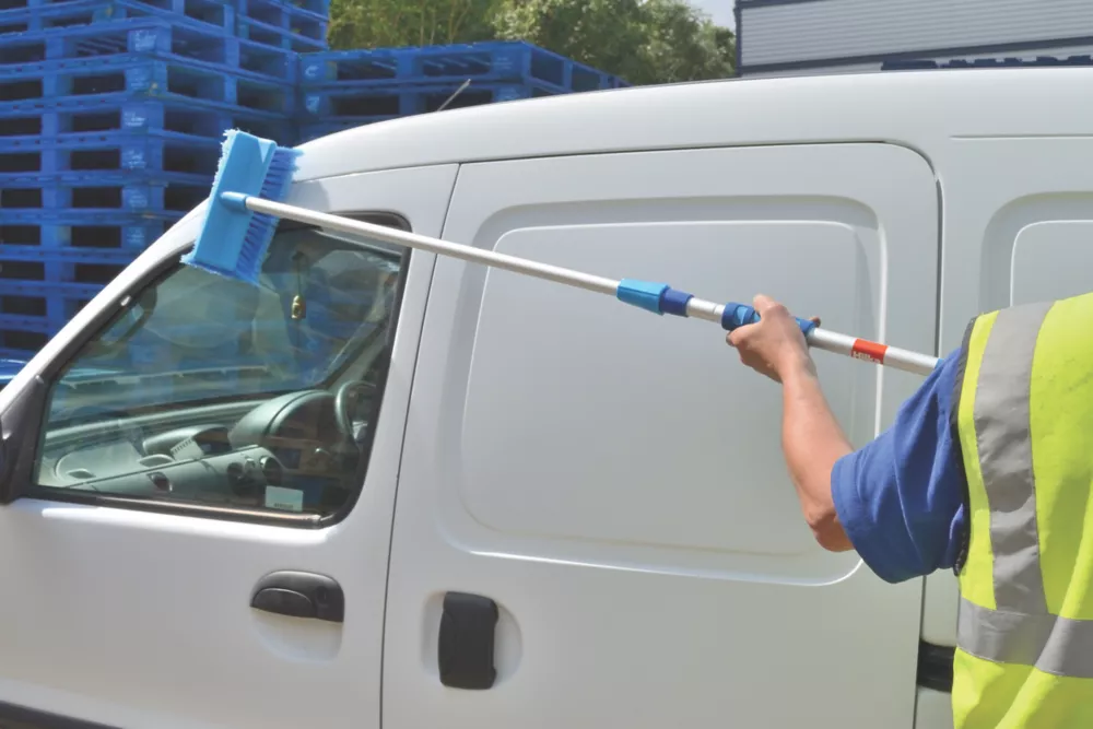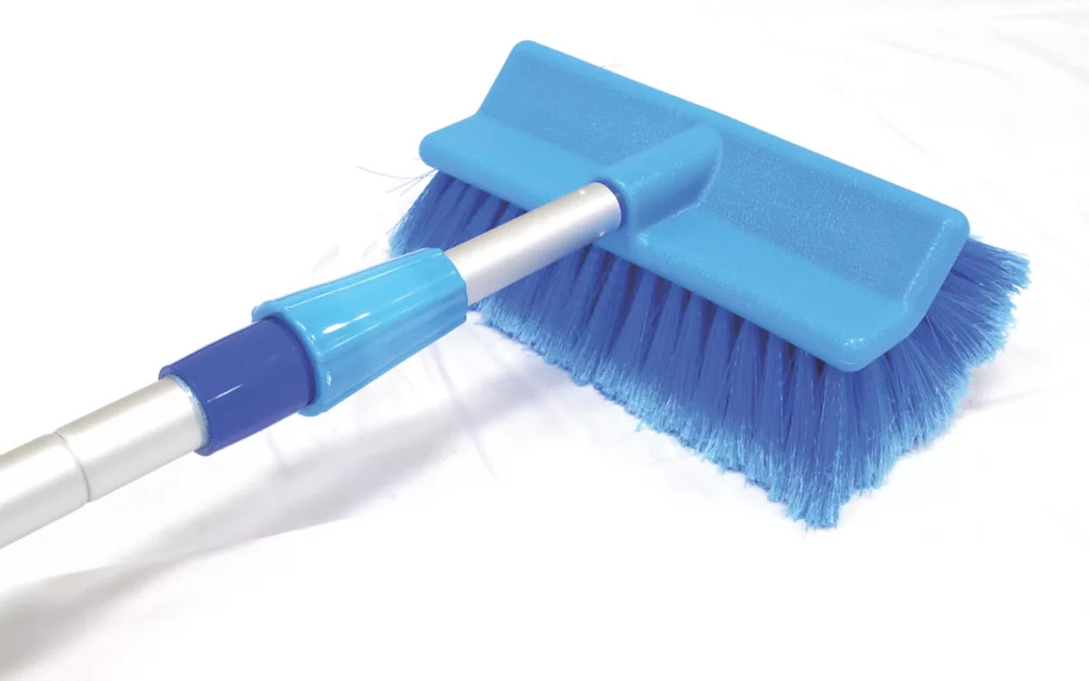 Comfortable, soft cushioned grips insulate against cold water running through handle. Lightweight, strong telescopic handle can be extended for cleaning in hard to reach areas. Feathered bristle tips for safe cleaning on all surfaces. Convenient on/off water switch.