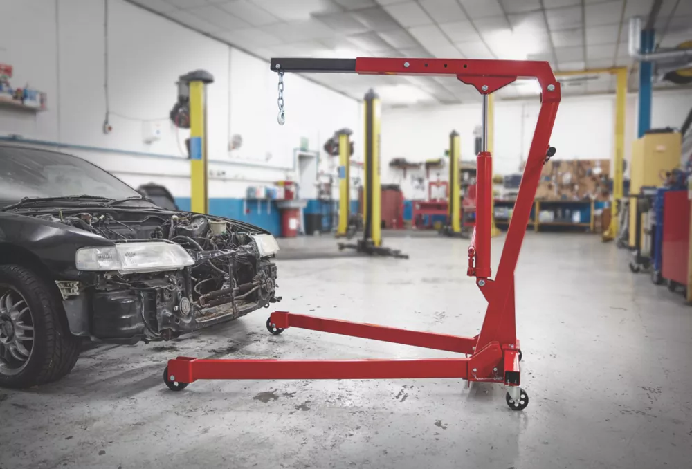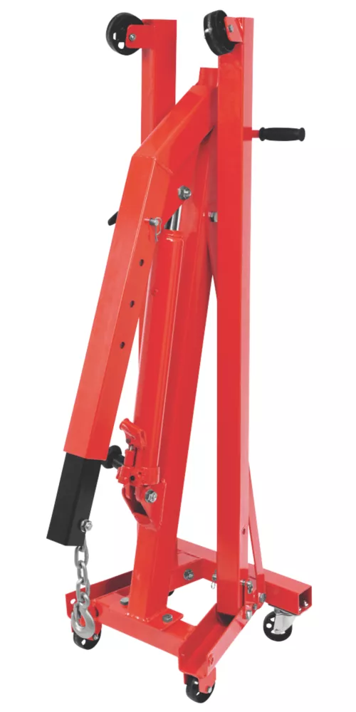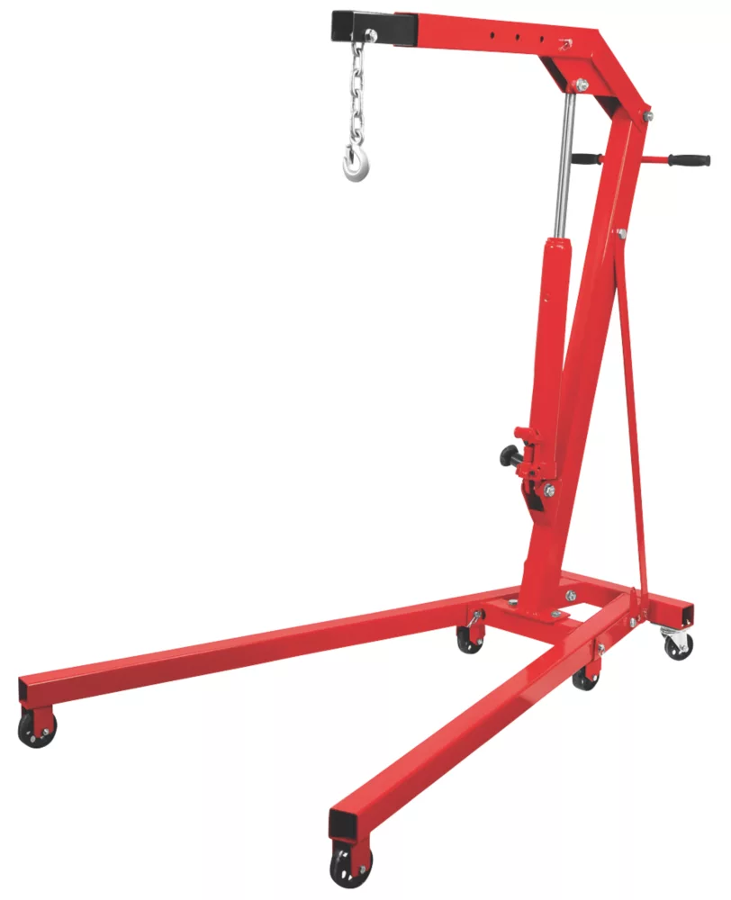 All steel hydraulic engine crane for fast and safe lifting. Includes swivel hook and 4 preset lifting positions. Foldable design allows for easy storage with sturdy castors for ease of movement.