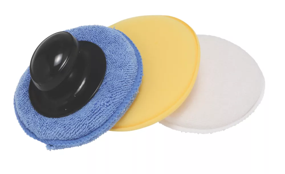 Extremely absorbent allowing for an even polish finish. Interchangeable handle to apply pressure. Yellow sponge pad suitable for applying polish or wax, white cotton pad for removing residue and blue microfibre pad for finishing.