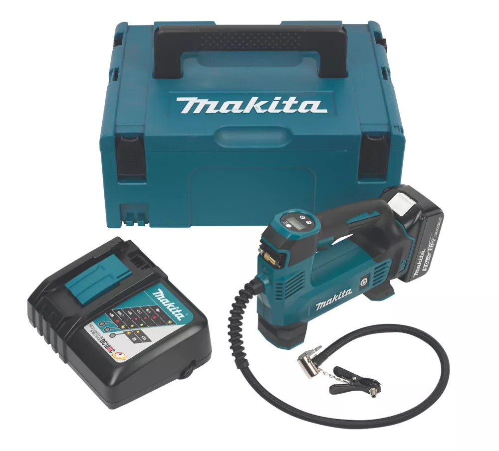 Cordless inflator suitable for inflating bicycle and vehicle tyres, sports balls and leisure equipment. Powered by an 18V Li-ion LXT slide-type battery to deliver up to 12Ltr per minute air discharge and 830kPa maximum air pressure. Equipped with digital air pressure gauge, LED job light and auto-stop function at pre-set target pressures. Features auto-off function to prevent accidental start-up during transportation and protection from over-heating. Thermostat activated to protect the inflator when the pump temperature increases and memory function to remember the last pressure settings. Supplied with valve adaptors and built-in adaptor storage. Battery protection circuit protects the battery from damages due to overheating, over-discharge and overload current. Not compatible with G-Series batteries.