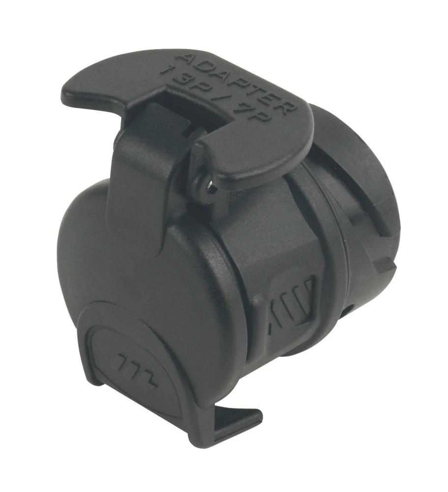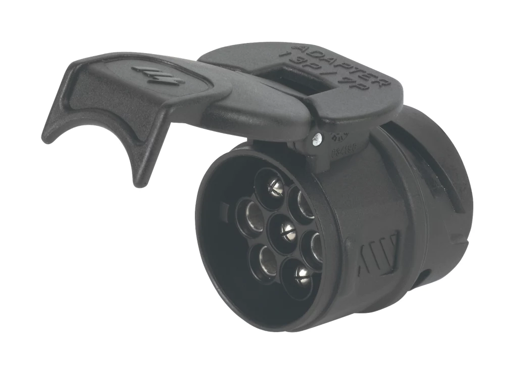 For converting a 7-pin plug on a caravan or trailer to fit a 13-pin socket on the towing vehicle.