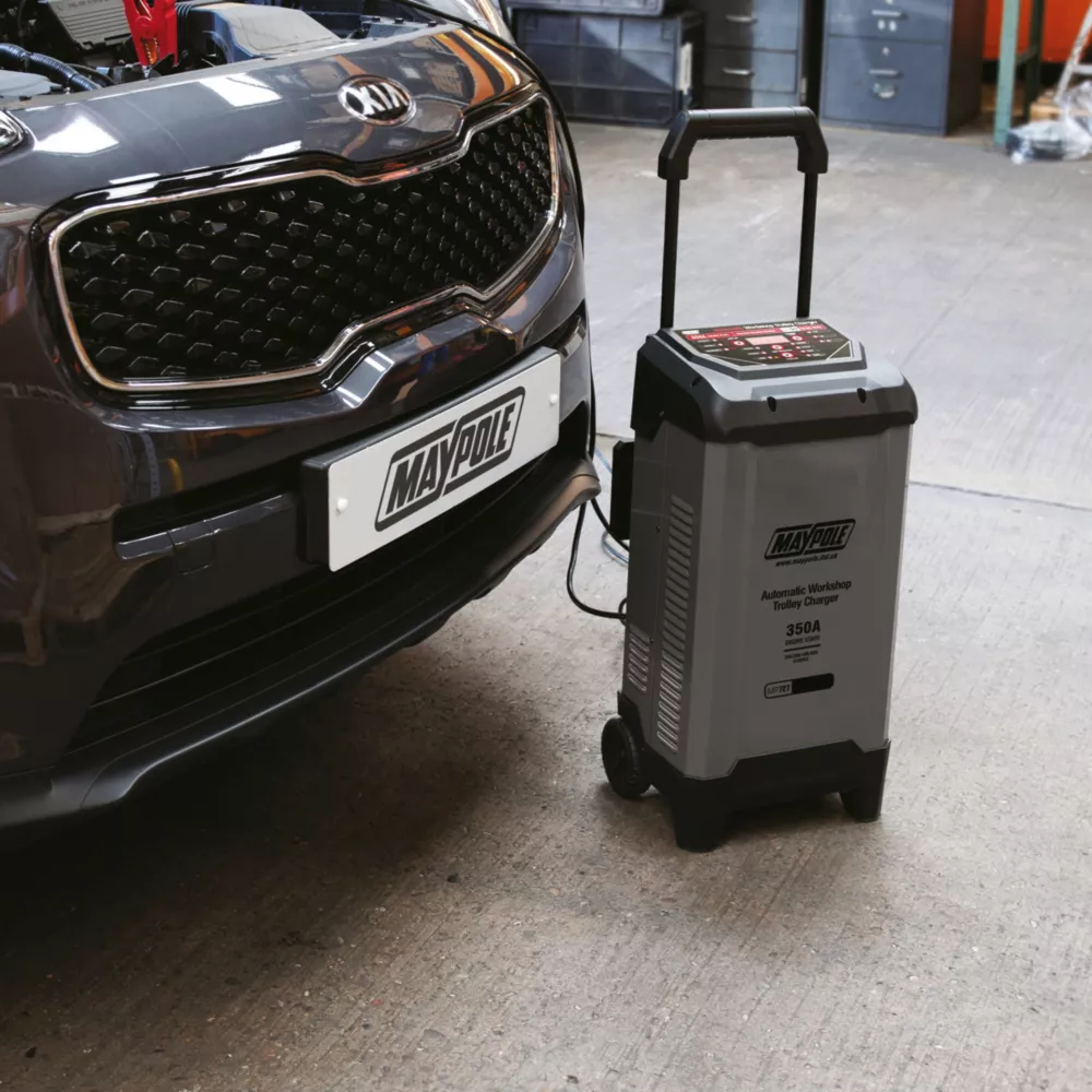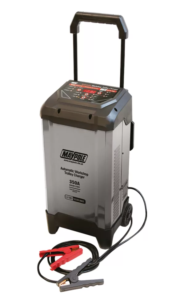 Start charger with built-in intelligent micro-processor and engine start function. Fully automatic 10-stage charging process. Recommended for cars, motorhomes and commercial vehicles. Built-in safety features include reverse polarity, short circuit, overload and over-current protection. Spark-proof. Features repair function for old or sulphated batteries as well as independent battery type selection. Informative digital display shows detailed rolling messages, charging process, battery voltage, battery full percentage and alternator percentage. Ideal for workshop environments. Easy and safe to use. Supplied with heavy duty clamps, 1.85m supply cable and 2m output cable.