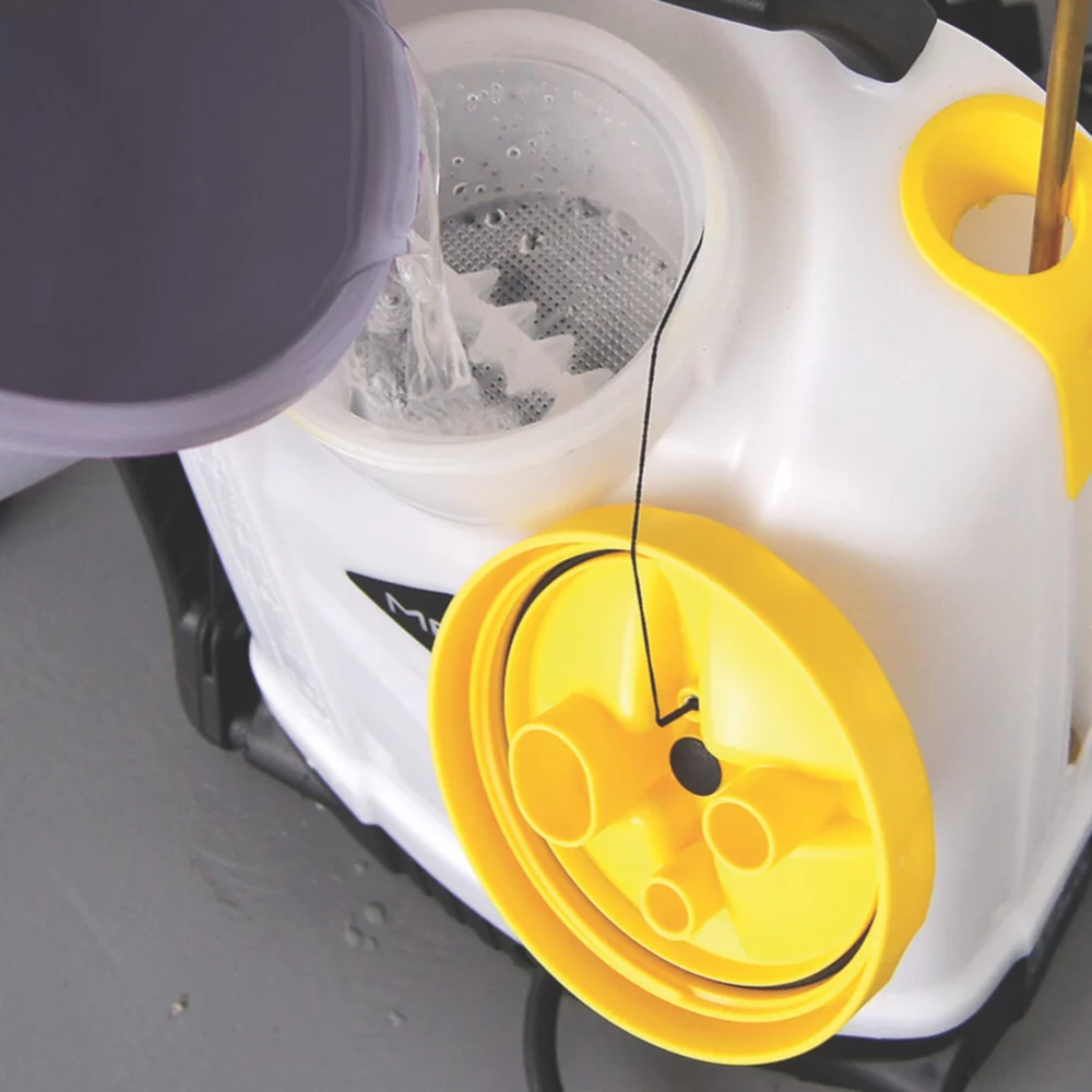 Suitable for professional users. Features extra-large filling opening with screen, tank cap, integrated measuring cup and captive loop. Drain channel directs any spilled liquid away from user’s back, ergonomic shut-off valve with filter and safety latch prevents unintentional spraying, and fully adjustable pump lever offers comfortable use. FKM chemical-resistant seals, and coated flat head nozzle and springs resist aggressive liquids, providing durability. Professional back harness with chest strap and hip belt and large, ergonomically-shaped back support area allows comfortable carrying. Also features spray and extension wand bracket and storage for spray shield. Pump lever can be installed on left or right side.