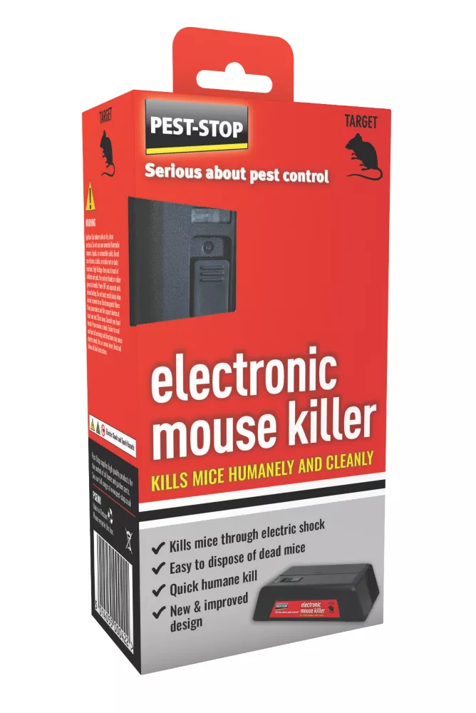 Battery-operated mouse killer. On entering the device, the mouse creates a circuit by touching the metal plates on the floor of the tunnel and is killed virtually instantly. Tamper-proof design, safe to use around children and pets (excluding rodent pets). Warning light signals mouse has been caught for up to 24 hours.