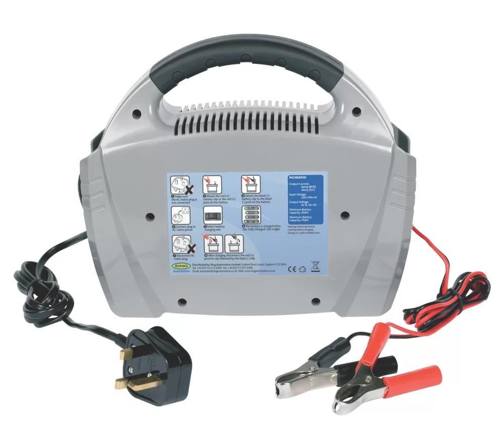 Dual voltage 6A charger, suitable for 6 and 12V vehicles including cars, vans and motorcycles. Includes 2 battery clamps.