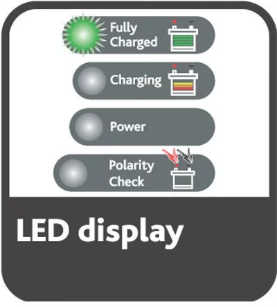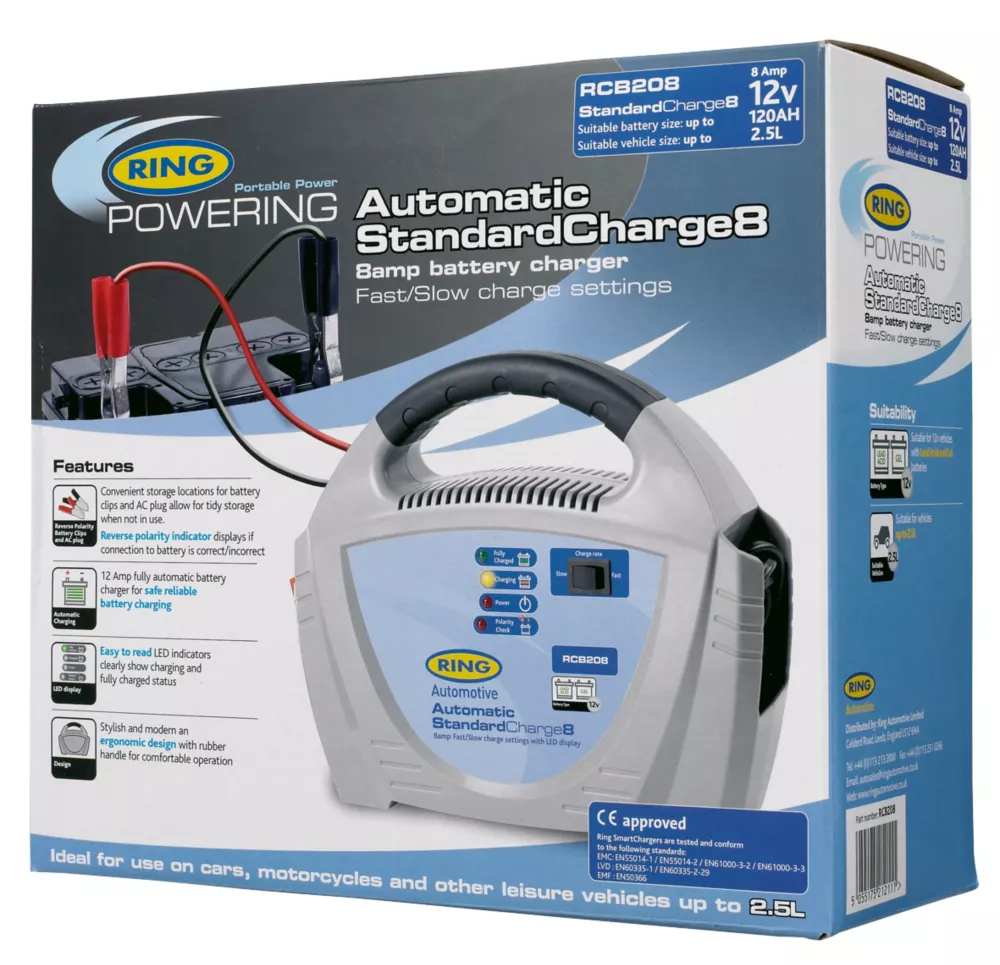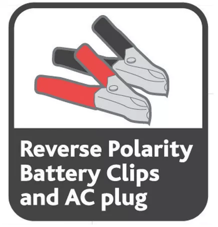 Fully automatic 8A battery charger suitable for 12V vehicles. Easy to read LED indicators. Storage for battery clips and AC plug.