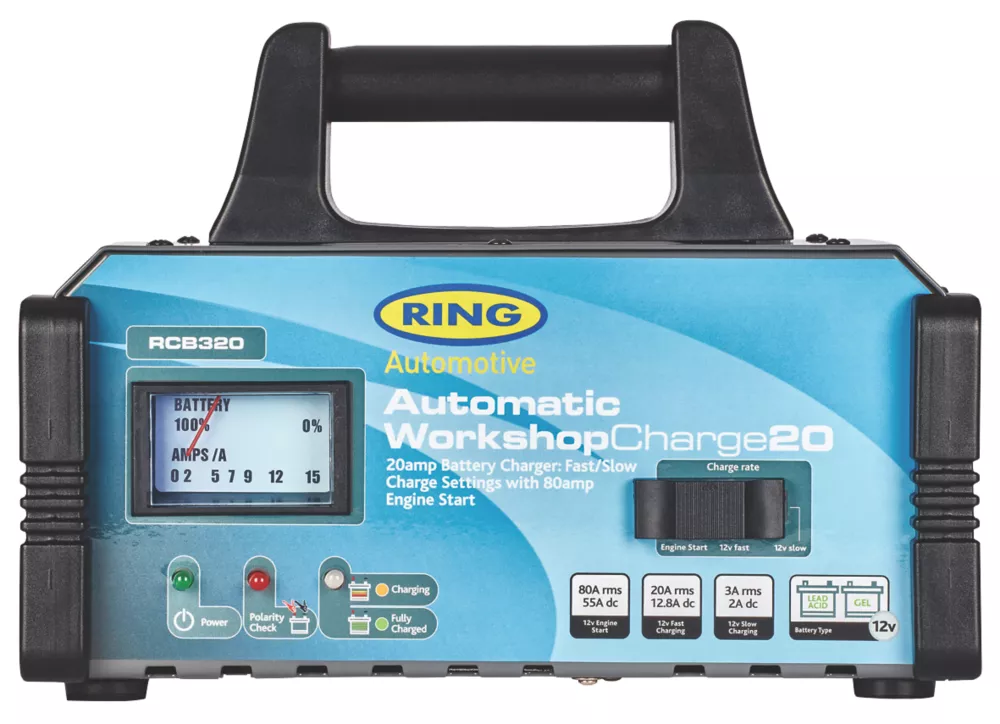 Robust workshop charger. Made from metal and rubber to withstand tough conditions. Suitable for 12V vehicles up to 12Ltr, including lawn mowers, motorcycles, boats, cars, vans, motorhomes and caravans. For use with lead acid and gel batteries. Fully automatic charger will switch from fast to slow charging once it detects that the vehicle battery is fully charged. Includes 80A main powered engine start to jump start flat batteries. Shows charging status on both ammeter and using LED indicators. Long 1.8m battery clamp cable. Supplied with carry handle.