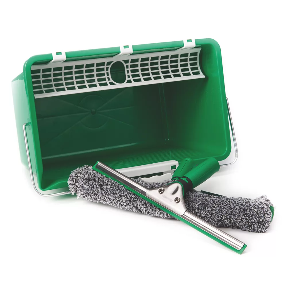 Kit containing 3 products, suitable for beginners and cleaning professionals. Includes ErgoTec power washer, ErgoTec squeegee complete with channel and handle, and 18Ltr bucket. Ideal for larger glass surfaces that need to be cleaned regularly. Can be used with Unger extension poles.