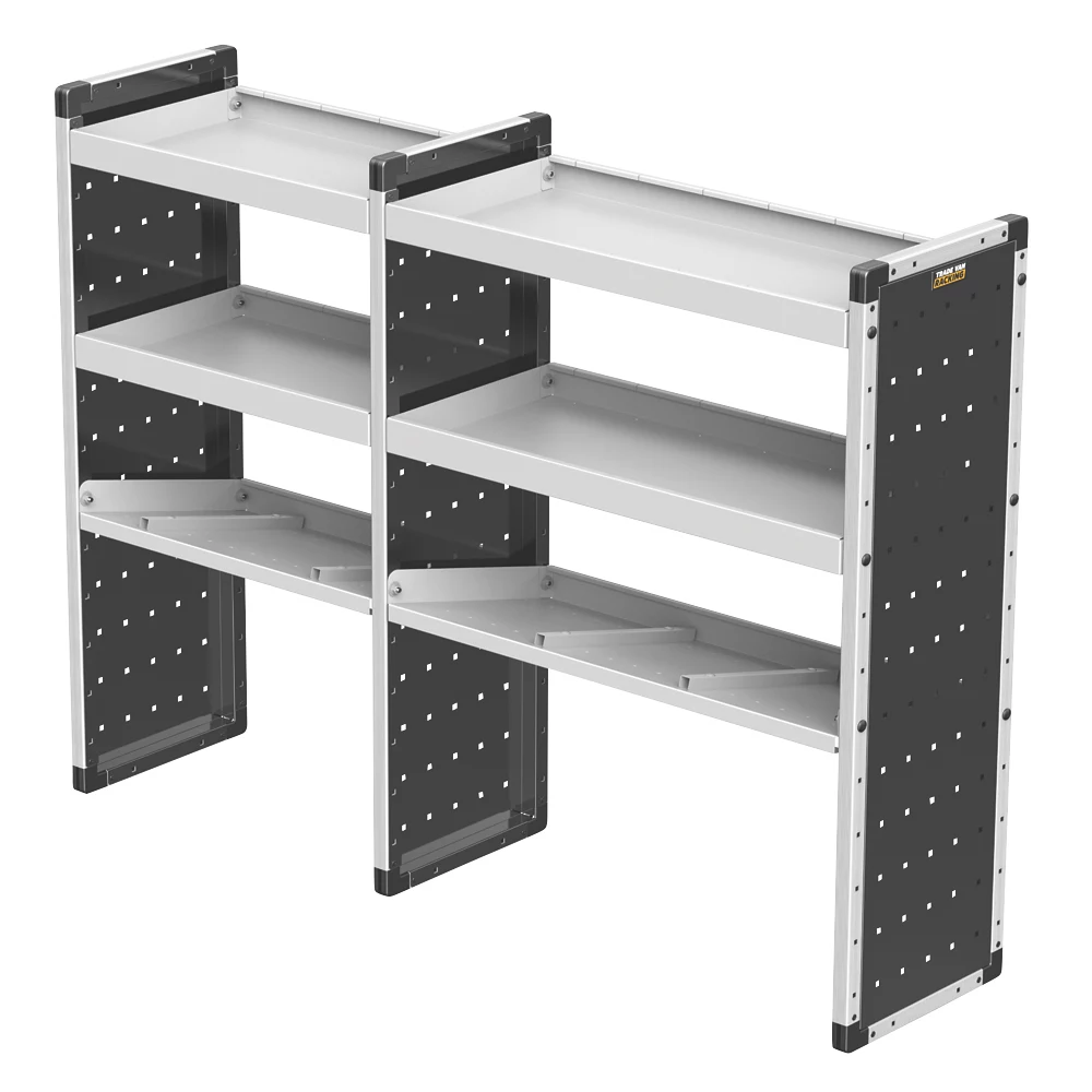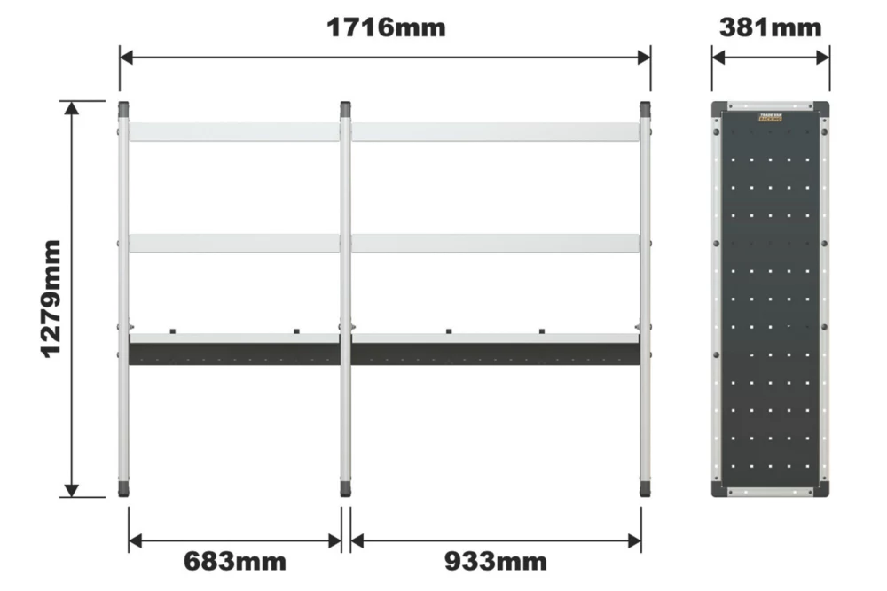 Easy to fit Universal Trade Van Racking double unit. Provides a lightweight, strong and flexible metal solution for effectively storing and organising power tools and components. Adjustable shelf height.