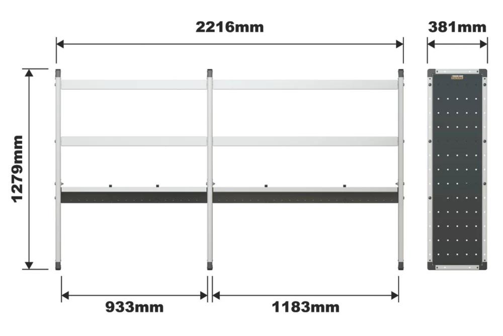 Easy to fit Universal Trade Van Racking double unit. Provides a lightweight, strong and flexible metal solution for effectively storing and organising power tools and components. Adjustable shelf height.