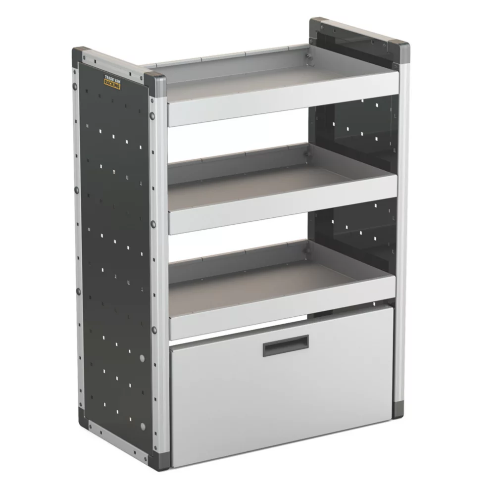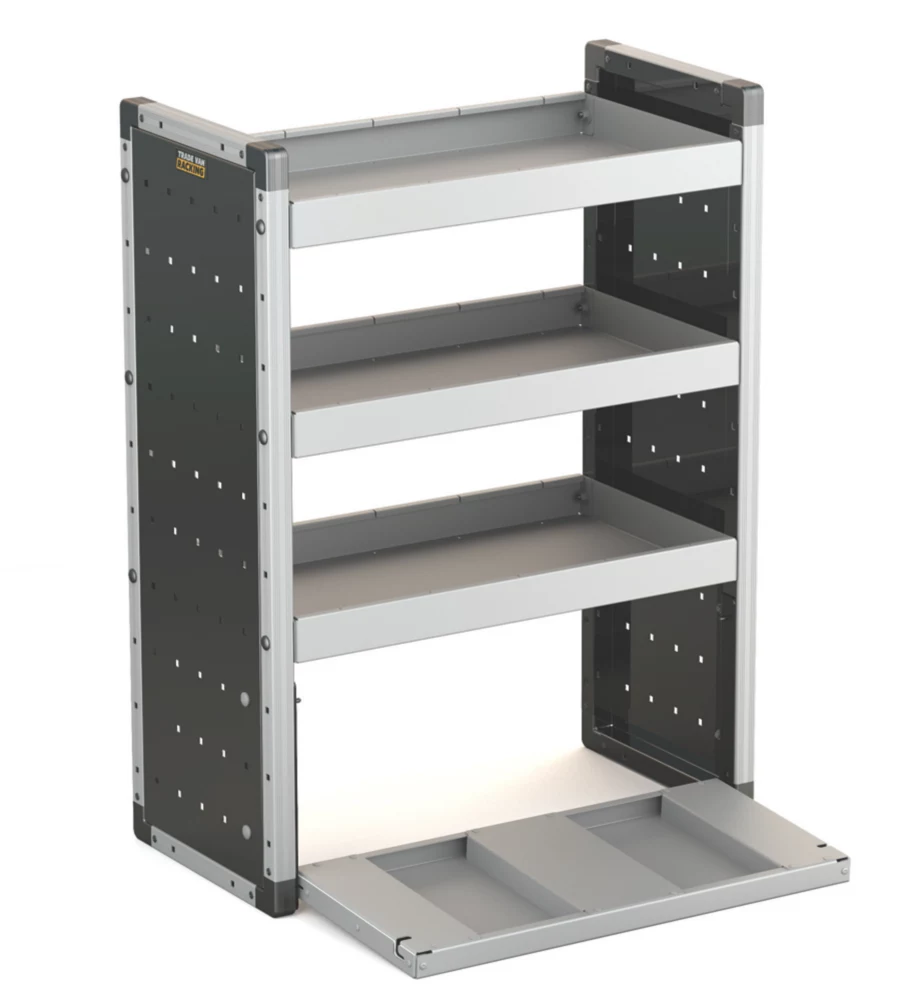 Drop-down door to suit 750mm wide Trade Van Racking units. Allows for easy access of larger items below bottom shelf. Aluminium construction is lightweight but strong. Finished in a tough silver and black powder coating. Easy to assemble.
