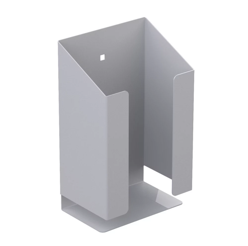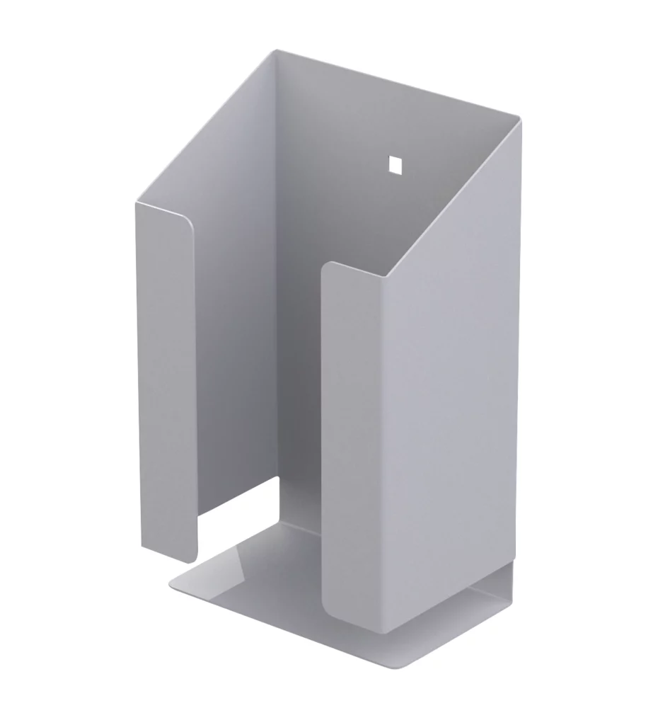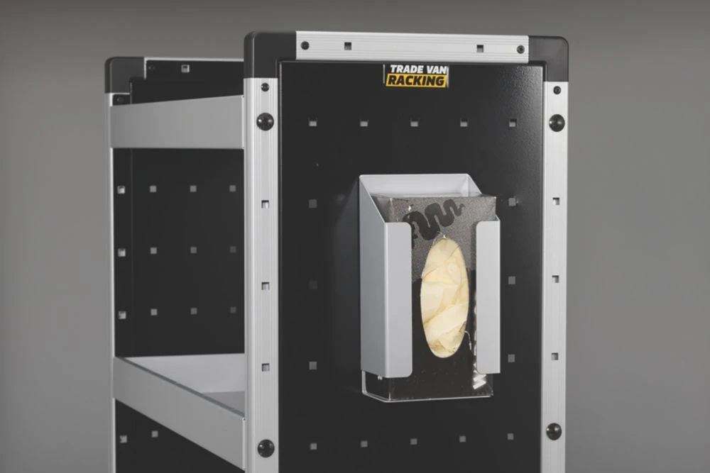 Glove box holder which easily fits the Trade Van Racking side panels. Allows for easy access of gloves from the rear or side of the van and can be positioned at a variety of heights. Strong aluminium and steel construction.